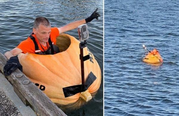 رحلة في يقطينة عملاقة .. أمريكي يقطع 95 كيلومترا في نهر كولومبيا!