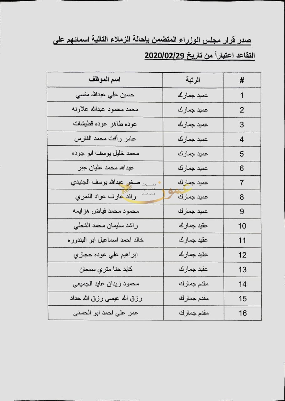قرر مجلس الوزراء احالة عدد من ضباط الجمارك الى التقاعد اعتبارا من تاريخ 29-02-2020. كما قرر وزير المالية احالة عدد من مرتبات الجمارك على الضمان المبكر اعتبارا من ذات التاريخ 29-02-2020. وتاليا الاسماء: