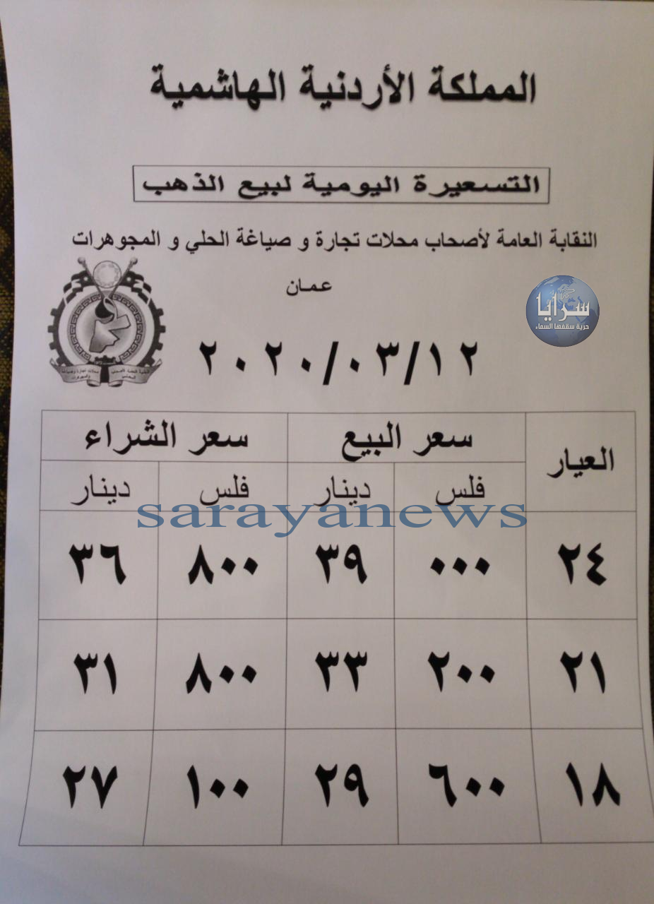 التقرير الدوري والمتجدد لأسعار الذهب الخميس12-03-2020 بالدينار الأردني وأيضا الدولار الأمريكي. يشمل التقرير أسعار المعدن بجميع عياراته (عيار 24, 22, 18, 14, 12) في الاردن.