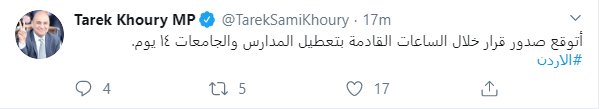 وقال خوري في منشور له عبر تويتر: "أتوقع صدور قرار خلال الساعات القادمة بتعطيل المدارس والجامعات ١٤ يوما".