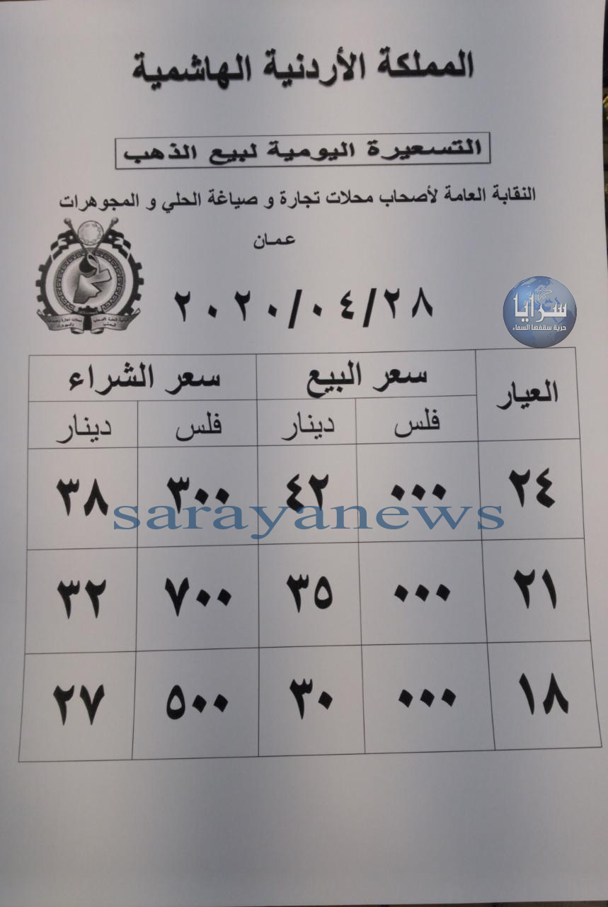 التقرير الدوري والمتجدد لأسعار الذهب الثلاثاء 2020/04/28 بالدينار الأردني يشمل التقرير أسعار المعدن بجميع عياراته (عيار 24, 22, 18, 14, 12) في الاردن.