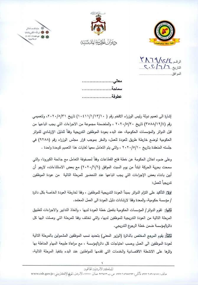عمم ديوان الخدمة المدنية على الدوائر الحكومية آلية التعامل مع المرحلة التالية لعودة الموظفين للعمل بعد الجائحة.