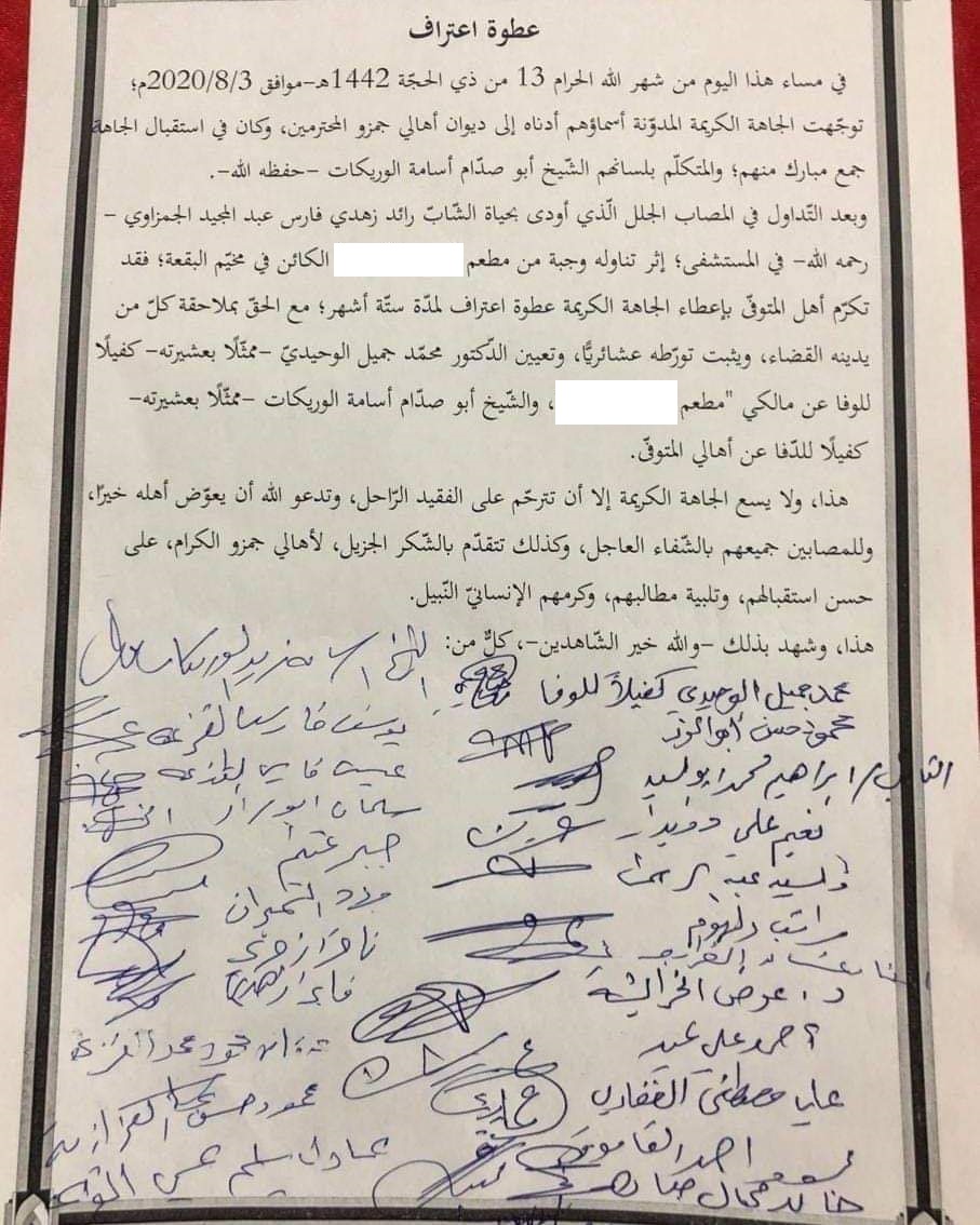واشترطت العطوة الاحتفاظ بحق بملاحقة كل من يدينه القضاء ويثبت تورطه عشائريا.