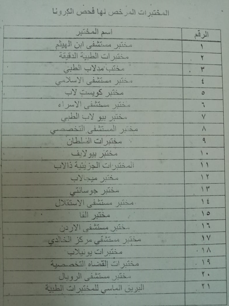 وشملت القائمة مختبرات مستشفى ابن الهيثم ومختبرات الطبية الدقيقة ومختبرات ميدلاب الطبي، ومختبرات مستشفى الاسلامي، ومختبرات كويست لاب، ومختبرات مستشفى الاسراء، ومختبر بي لاب الطبي، ومختبر المستشفى التخصصي، ومختبرات السلطان، ومختبر بيو لايف، والمختبرات الجزيئية ذالاب، ومختبر ميجالاب، ومختبر جوسانتي، ومختبر مستشفى الاستقلال، ومختبر الفا، ومختبر مستشفى الاردن، ومختبر مستشفى مركز الخالدي، ومختبرات يونيلاب، ومختبرات القضاة التخصصية، ومختبر مستشفى الرويات، ومختبر الماسي للمختبرات الطبية.