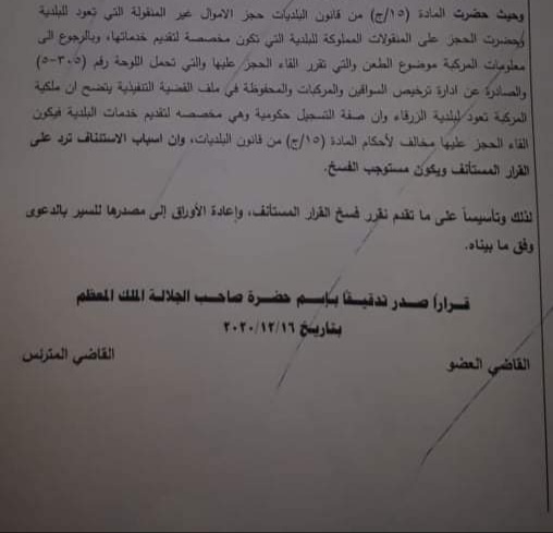 قال الناطق الاعلامي باسم بلدية الزرقاء ينال المعاني إن المحكمة اصدرت قرارا صباح اليوم الخميس بفسخ قرار الحجز على مركبة الرئيس كون صفة التسجيل حكومية ومخصصة لتقديم خدمات البلدية والحجز عليها مخالف لاحكام المادة (١٥/ج) من قانون البلديات.