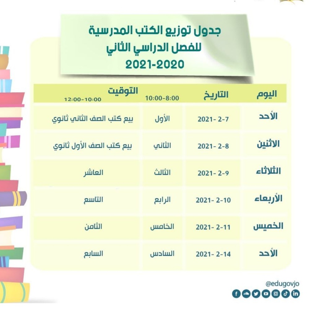 مخصص لتوزيع كتب الصف العاشر، والاربعاء للصف التاسع والخميس للصف الثامن،