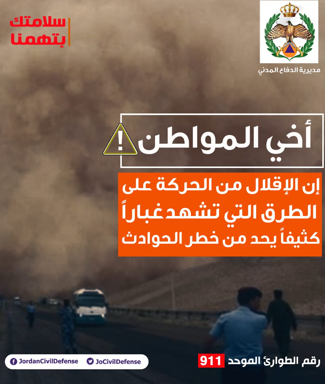 حذرت مديرية الدفاع المدني الخميس، من الحركة على الطرق التي تشهد غبارا كثيفا. وقالت المديرية عبر صفحتها على فيسبوك إن الاقلال من الحركة على الطرق التي تشهد غباراً كثيفاً يحد من خطر الحوادث.