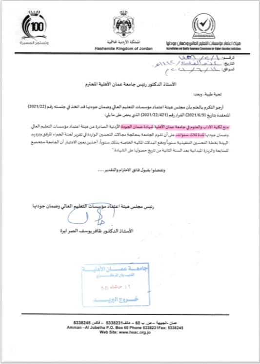 بدعم من هيئة المديرين لجامعة عمان الاهلية ورئيسها الدكتور ماهر الحوراني ، وبإشراف وتوجيهات رئيس الجامعة الأستاذ الدكتور ساري حمدان ، أضافت الجامعة إنجازات جديدا في سجل إنجازاتها ، فبعد حصول كليات ( الأعمال و تقنية المعلومات والصيدلة والحقوق ) في الجامعة على شهادة ضمان الجودة الأردنية الممنوحة من هيئة الإعتماد الأردنية لمؤسسات التعليم العالي وضمان جودتها ، حازت كلية الآداب والعلوم في الجامعة على شهادة ضمان الجودة الأردنية أيضا، وذلك بجهود نائب رئيس الجامعة لشؤون الكليات الإنسانية / عميد الكلية الأستاذ الدكتور نايل الشرعة وأعضاء الهيئتين التدريسية والإدارية في الكلية، وبمتابعة من الدكتور إياد شعبان / مساعد الرئيس للشؤون الإدارية / مدير وحدة الشؤون الإدارية والتطوير المؤسسي في الجامعة.