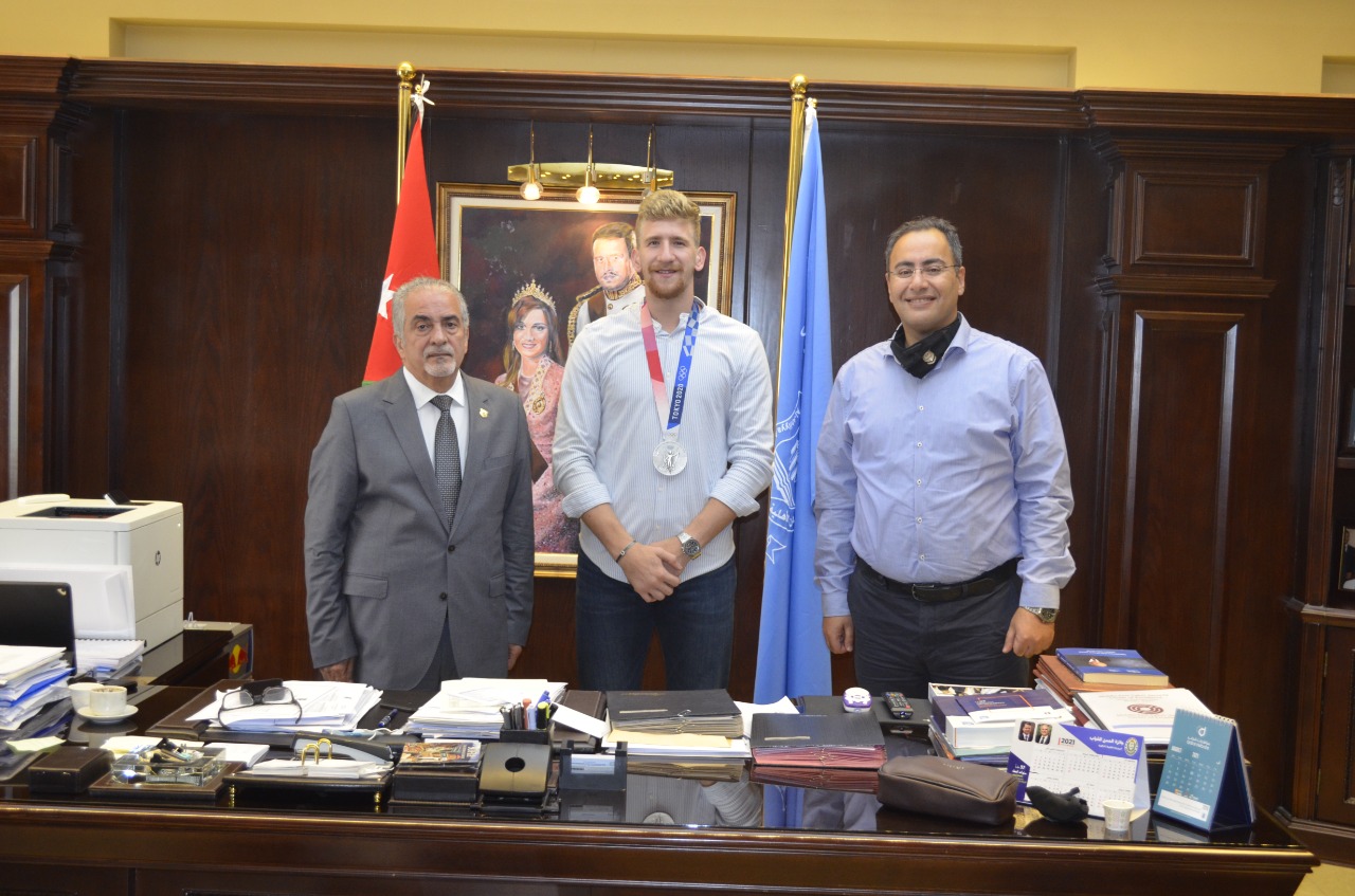 وفي نهاية اللقاء قام الرئيس بتقديم درع الجامعة للشرباتي، مؤكداً عزم الجامعة على إقامة حفل تكريم له برعاية رئيس هيئة المديرين الدكتور ماهر الحوراني يليق بإنجازه مطلع العام الدراسي 2021/2022 وبحضور العمداء وأعضاء الهيئتين التدريسية والإدارية والطلبة المقبولين على نظام التفوق الرياضي في الجامعة.