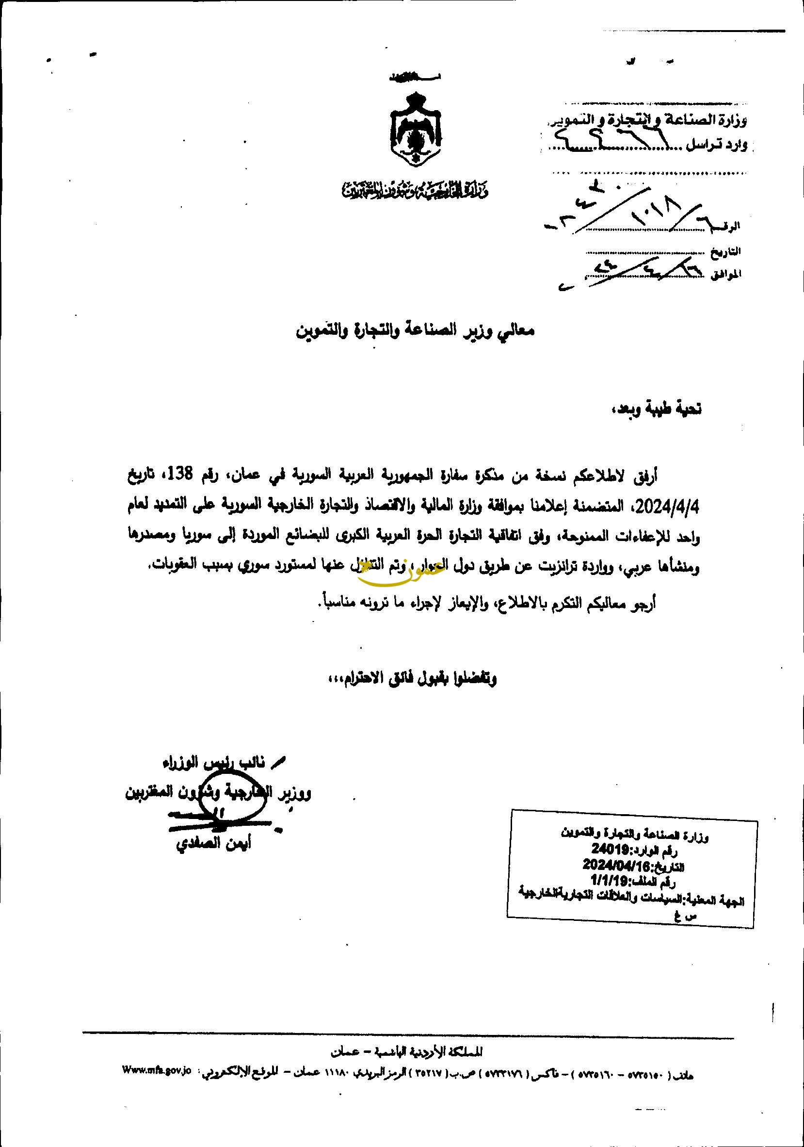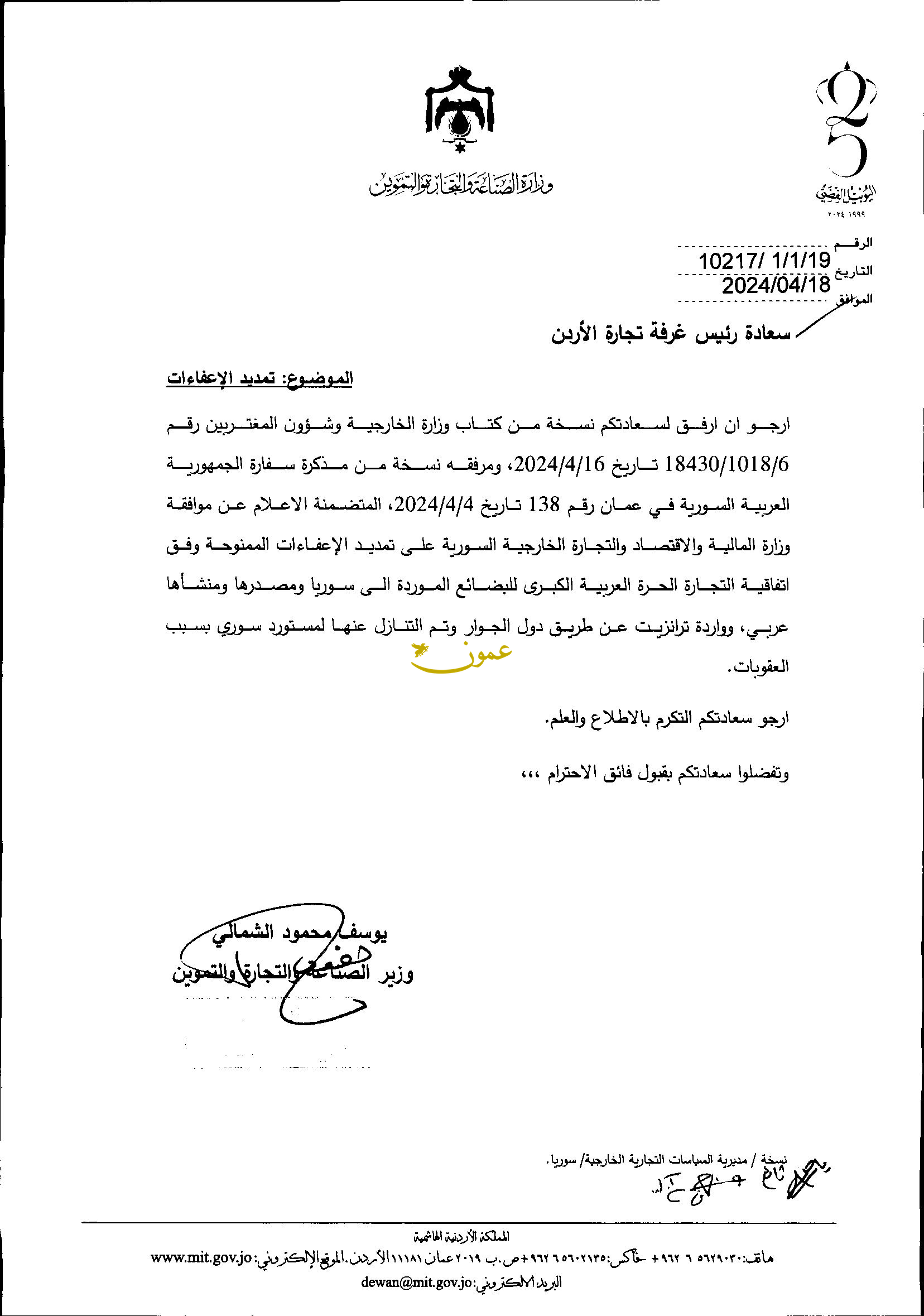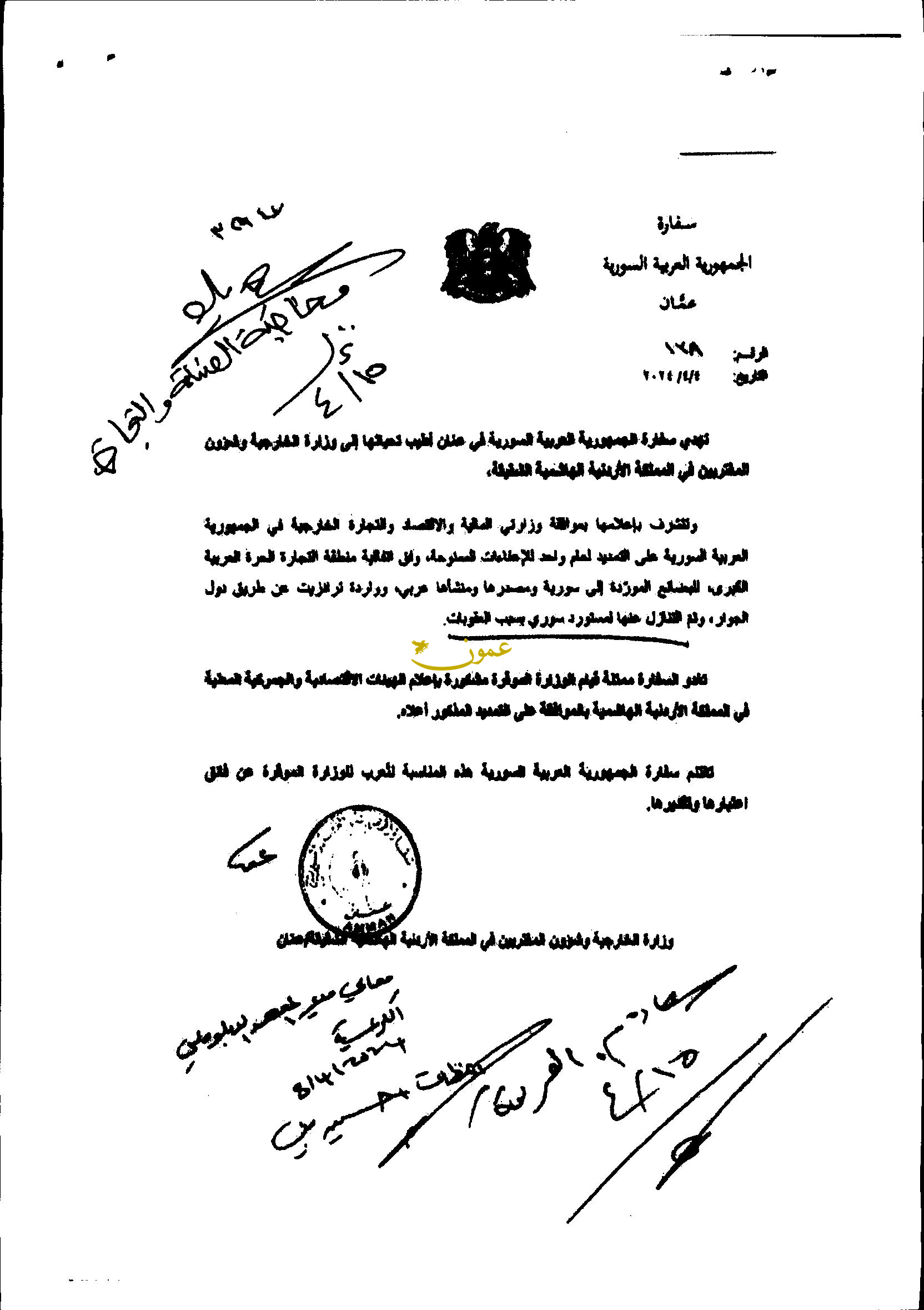 خاطبت السفارة السوريّة في عمّان، وزارة الخارجية وشؤون المغتربين، بشأن الموافقة على التمديد لعام واحد للإعفاءات الممنوحة، وفق اتفاقية التجارة الحرة العربية للبضائع.