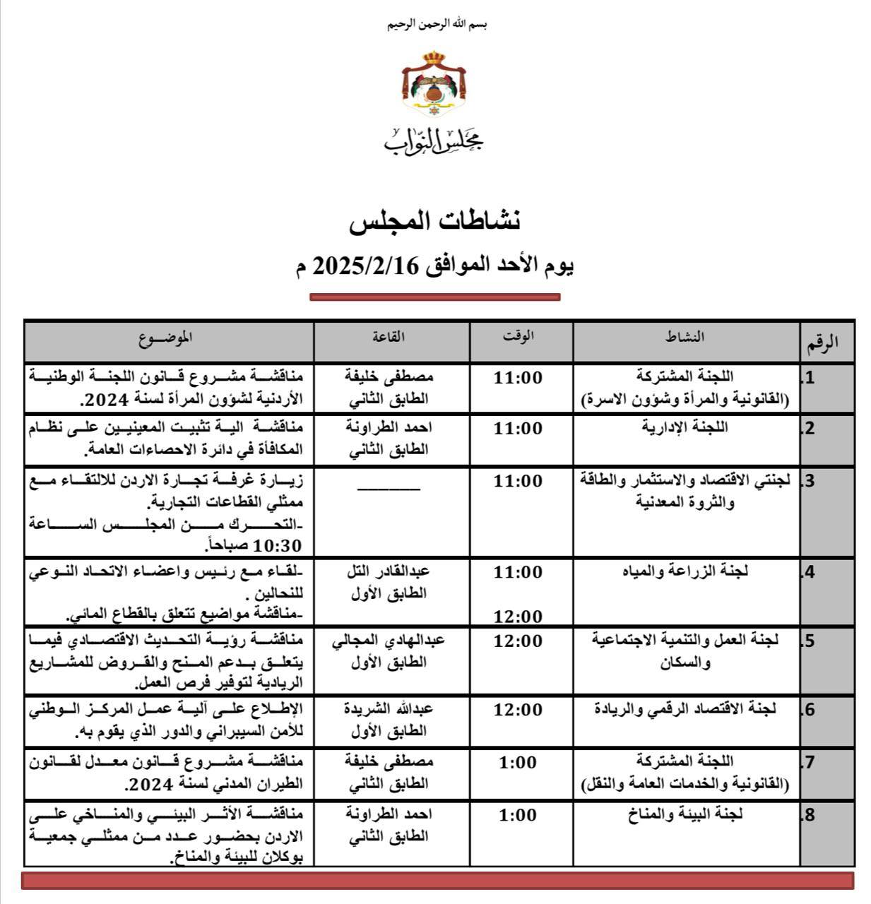 كما تجتمع لجنتا الاقتصاد والاستثمار والطاقة والثروة المعدنية لزيارة غرفة تجارة الأردن للقاء ممثلي القطاع، فيما تلتقي لجنة الزراعة والمياه مع رئيس وأعضاء الاتحاد النوعي للنحالين لمناقشة مواضيع تتعلق بالقطاع المائي.