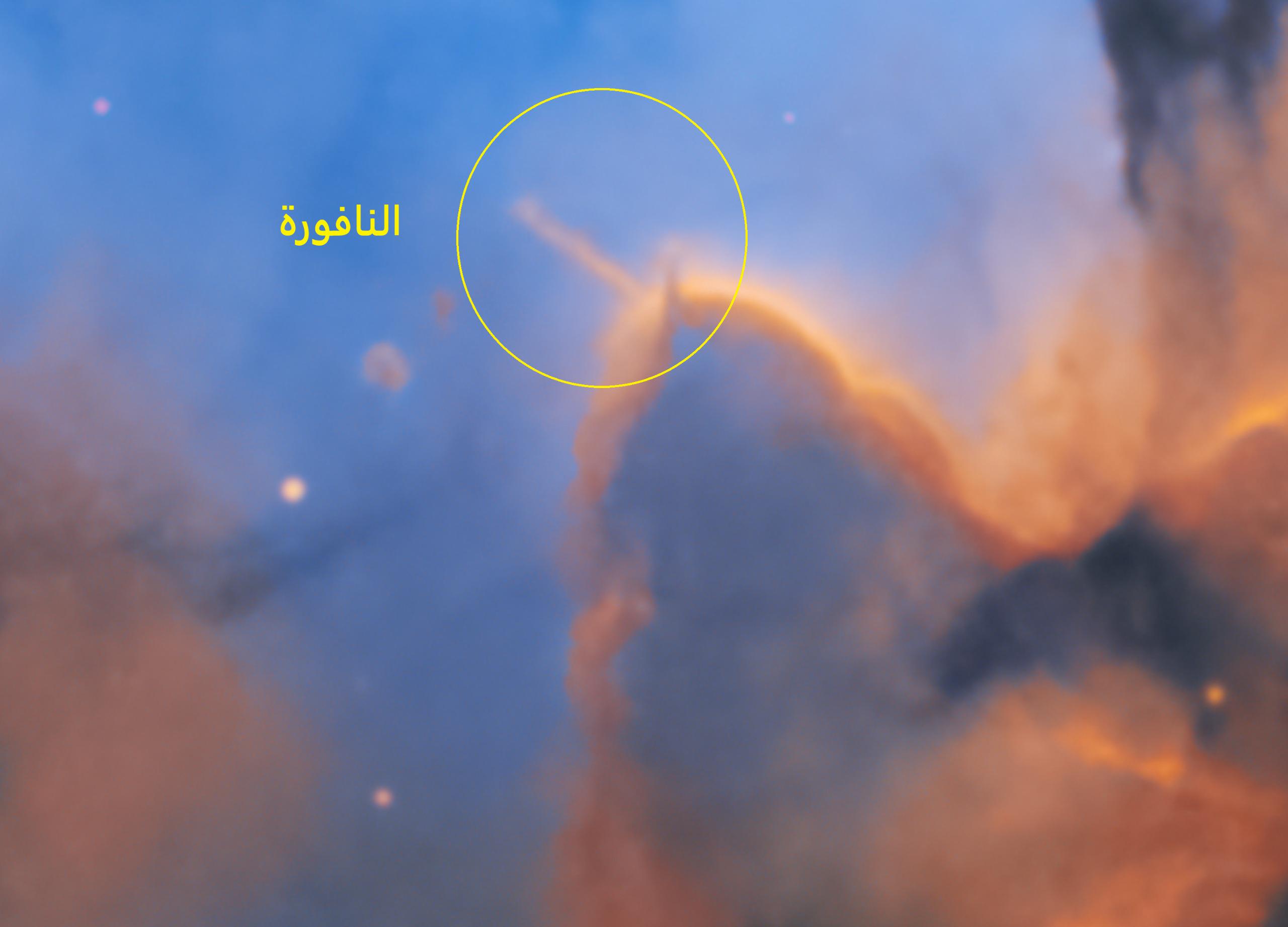 وتُظهر الصورة بجلاء نافورة نجمية تتدفق من إحدى السحب الغازية في قلب السديم على شكل "قرنين". هذه النافورة ناتجة عن ولادة نجم جديد داخل السحابة، حيث تدفع طاقته المنطلقة الغازات المحيطة به إلى الخارج، مشكلةً مشهداً سماوياً أخّاذاً يرمز إلى بداية حياة نجم في مجرتنا. ويبلغ طول النافورة حوالي ثلاثة أرباع سنة ضوئية.