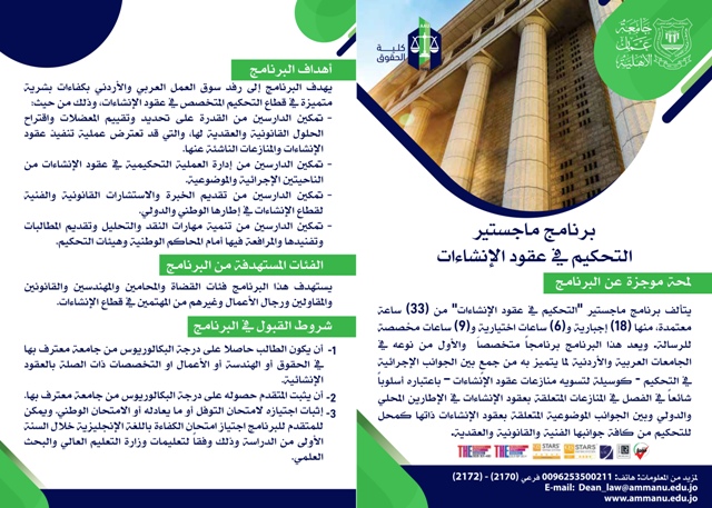 حقوق عمان الاهلية تعلن فتح باب التسجيل للفصل الثاني لماجستير التحكيم في عقود الانشاءات ..المقاعد محدودة