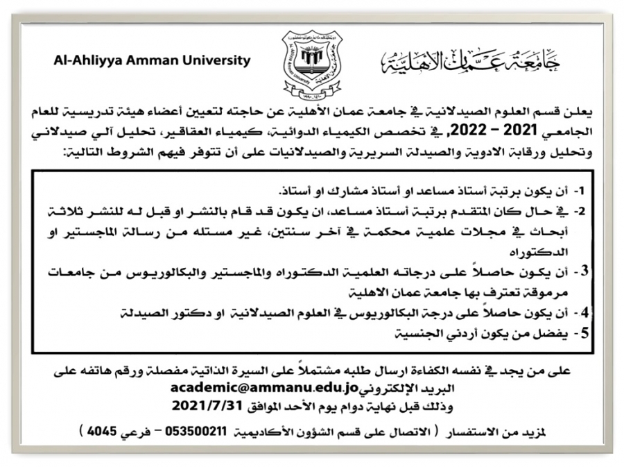 • قسم العلوم الصيدلانية في عمان الأهلية يعلن عن حاجته لتعيين أعضاء هيئة تدريسية