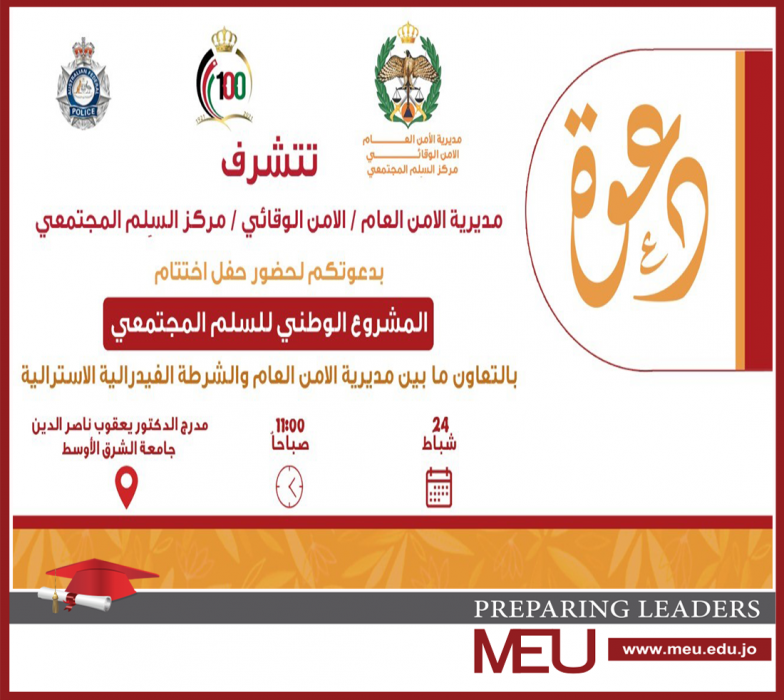 جامعة الشرق الأوسط MEU تعقد ورشاتٍ تدريبية بالتعاون مع مديرية الأمن العامِّ / مركزالسِّلم المُجتمعيّ والشرطة الفيدراليَّة الاستراليَّة